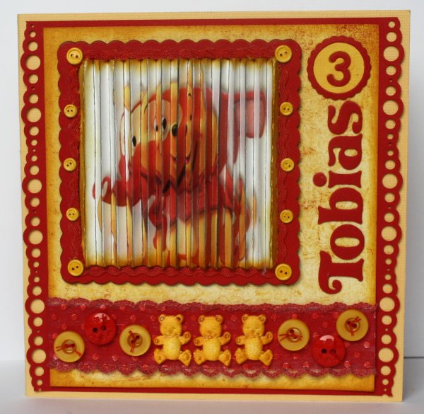 Og sånn ble innsiden. Bamseborden er egentlig et hvitt bånd som jeg har sammen med babytingene. Men med litt gulfarge passet det på dette kortet. Fargene på kortet ga jo seg selv i om med at figurene er gule og rød.